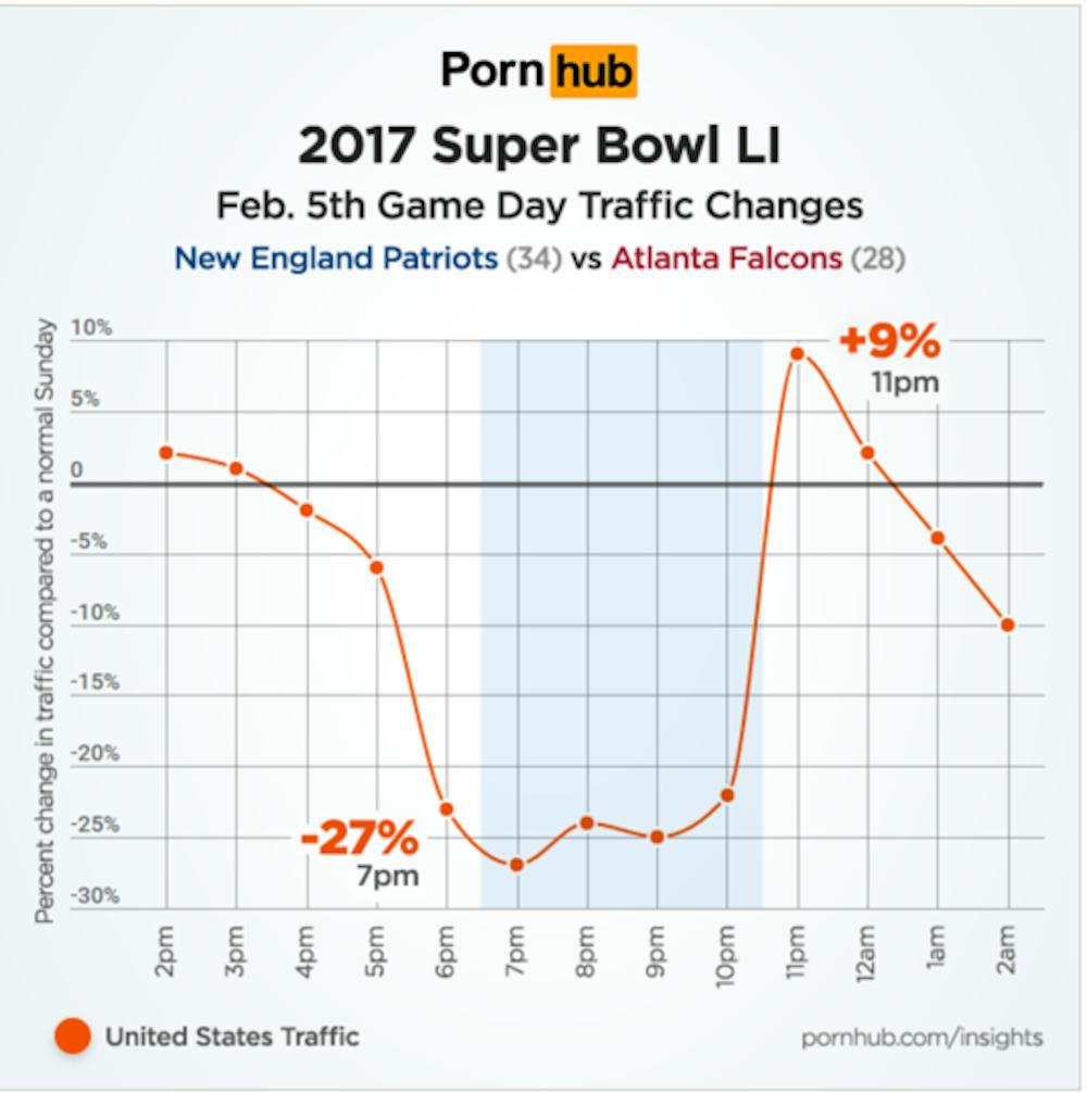 However, no one should be surprised that Pornhub’s traffic falls heavily when it comes to Super Bowls or Game of Thrones episodes. The data collected below is from 2017’s Super Bowl 51 and 2018’s Super Bowl 52. The graph shows that the decline in traffic happens after 3 p.m. in the afternoon and continually goes down with 51’s low being 27 percent below average at 7 p.m. and 52’s low being 28 percent at 9 p.m. It makes sense that the reason for the low traffic is because it's one of the biggest sports events of the year with all the best commercials and movie trailers dropping throughout the game. However, after the game is done, the traffic shoots back up to 9 percent above the average for both Super Bowls.