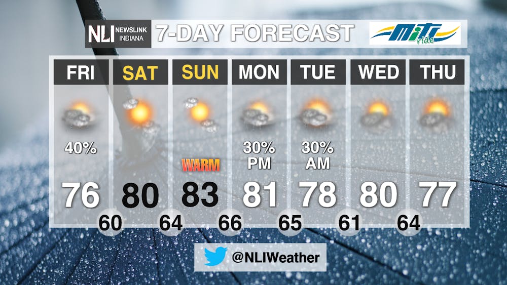 Tomorrow: Friday, scattered showers persist throughout the day with partly cloudy skies. A high of 76 degrees for Muncie with southwesterly winds 5-10 mph. Later in the night, lows drop into the upper 50s to lower 60s with clearing skies.