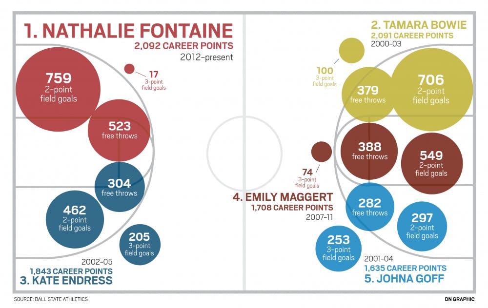 Senior guard Nathalie Fontaine is now the all-time Ball State women's basketball scoring leader with 2,092 points. With four seconds left against Northern Illinois, Fontaine already had 21 points in the game and 2,090 in her career — 1 point shy of Tamara Bowie’s Ball State record of 2,091 career points.