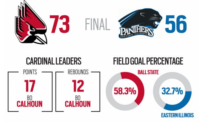 The Ball State men’s basketball team etched their first win of the season on Monday night, 73-56 over Eastern Illinois. Senior Bo Calhoun came off the bench under three minutes into the game after Franko House got into early foul trouble and led the team in scoring with 17 points.