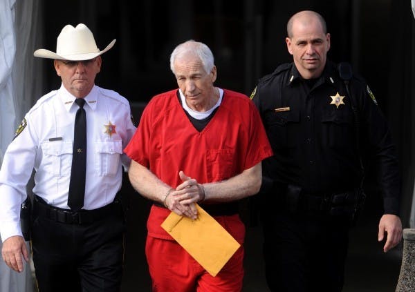 BELLEFONTE, Pa. - In what sounded at times like a locker room pep talk, Jerry Sandusky rambled in his red prison suit about being the underdog in the fourth quarter, about forgiveness, about dogs and about the movie "Seabiscuit." -á