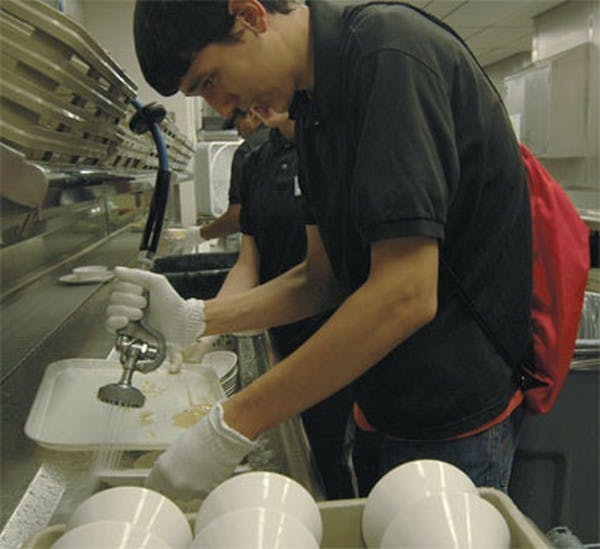 Sophomore Nat Blue is thankful for the ability to work in Dining Services the maximum 20 hours per week to help him and his single mother pay for his tuition. In Noyer's Retreat, business major Blue and his fellow students work in the dish room for diners, allowing them to eat with clean silverware and plates.