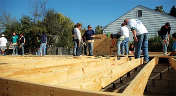Wielding hammers and nails, dozens of Ball State University students joined a crew from Habitat for Humanity to help build a home for a Muncie family. Members of Panhellenic Council and other students gathered in a Muncie neighborhood to work on a house's foundation on Saturday.