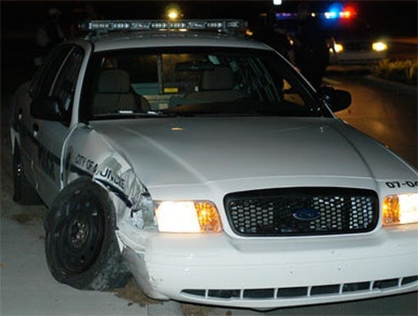 A City of Muncie police car sped around a corner, hit a light pole and skidded across the curb around 1 a.m. Tuesday in front of LaFollette Complex, according to eyewitness accounts. Freshman exercise major Ryan Lee said he was in his room when he heard the screech and looked out his window.