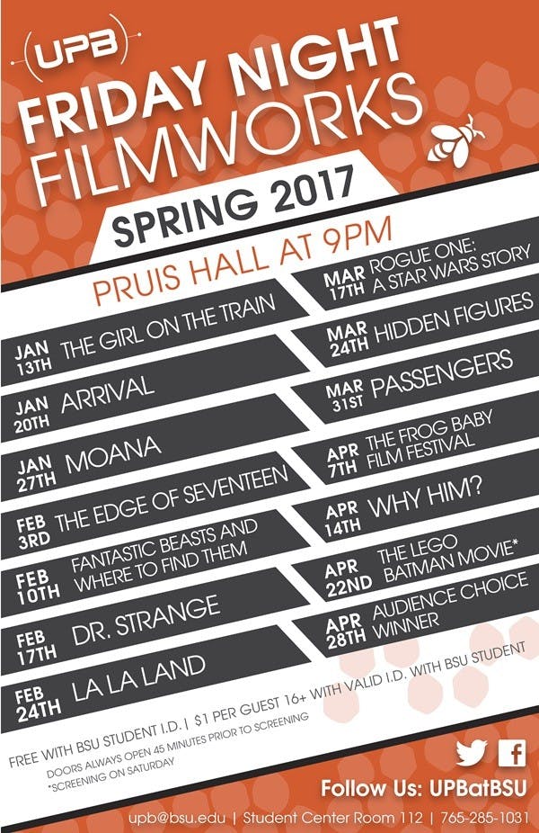 The University Program Board started off Friday Night Filmworks at Quad Bash this semester, but there are still plenty of Fridays left to see a movie at Pruis Hall.