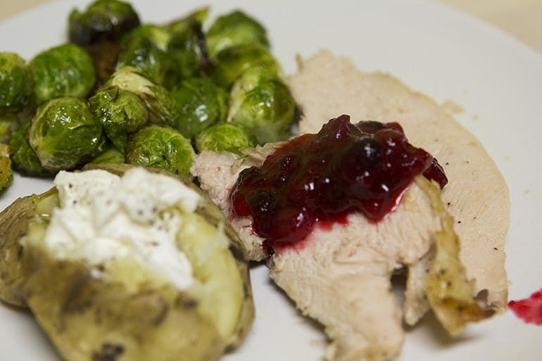 We know not everyone will make it home for Thanksgiving — but that shouldn't stop you from cooking something nice. This Thanksgiving dinner can be made in a little more than an hour and has all of the classics (even turkey!).