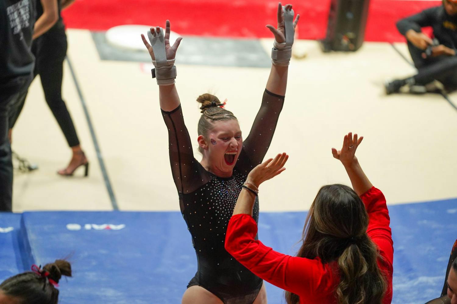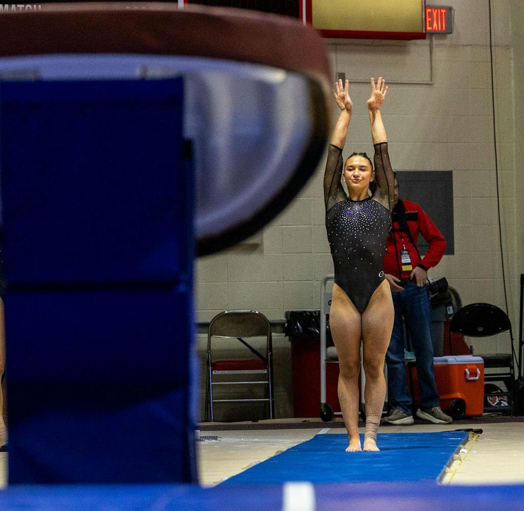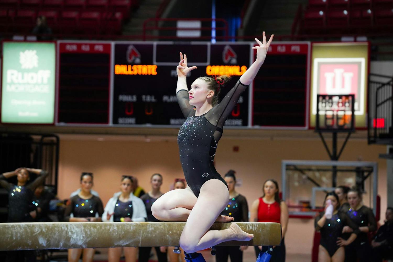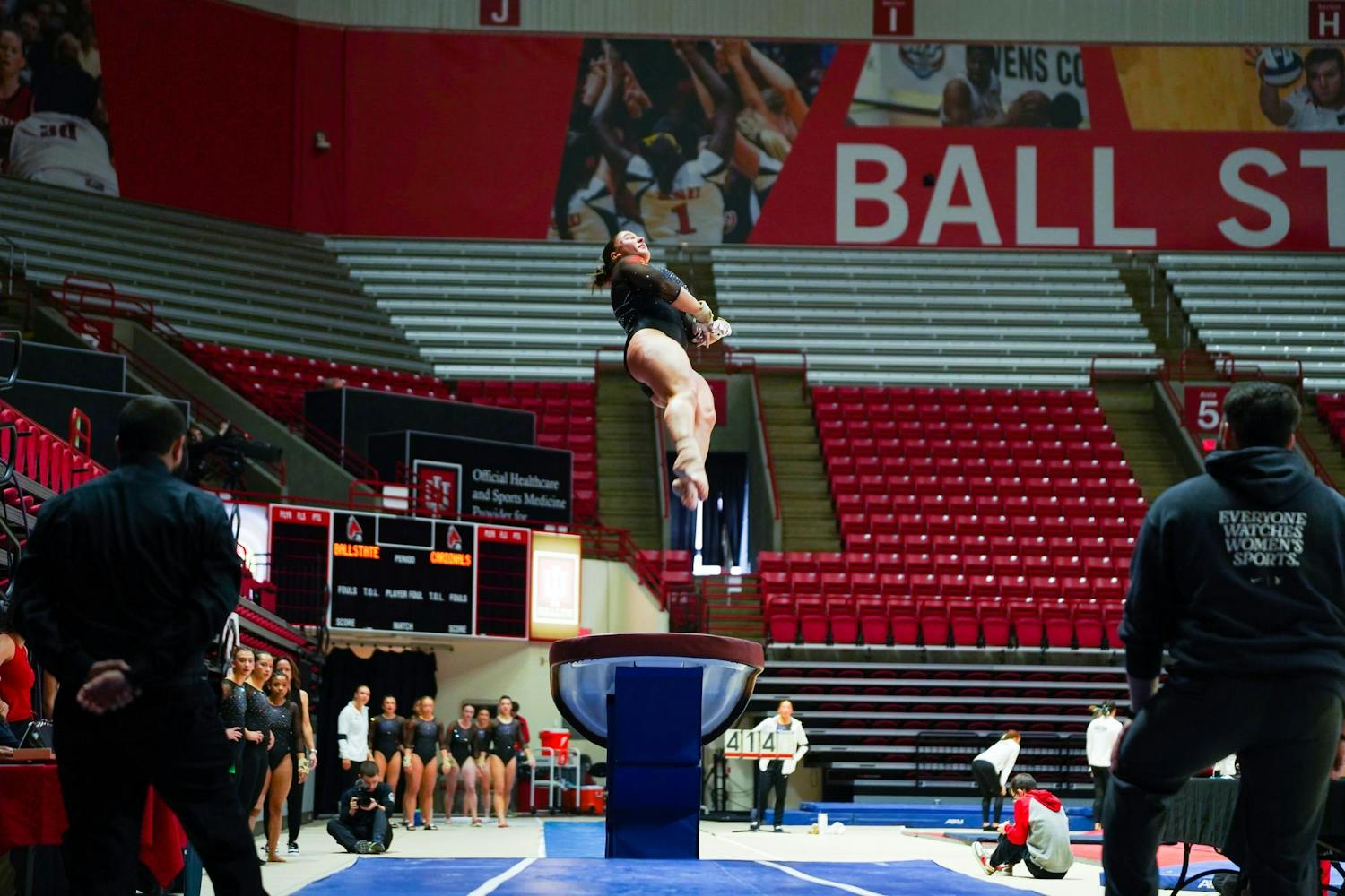 Ball State Gymnastics Team won against Eastern Michigan with a score of 195.025 vs 194.125 on Feb. 12 in Worthen Arena.