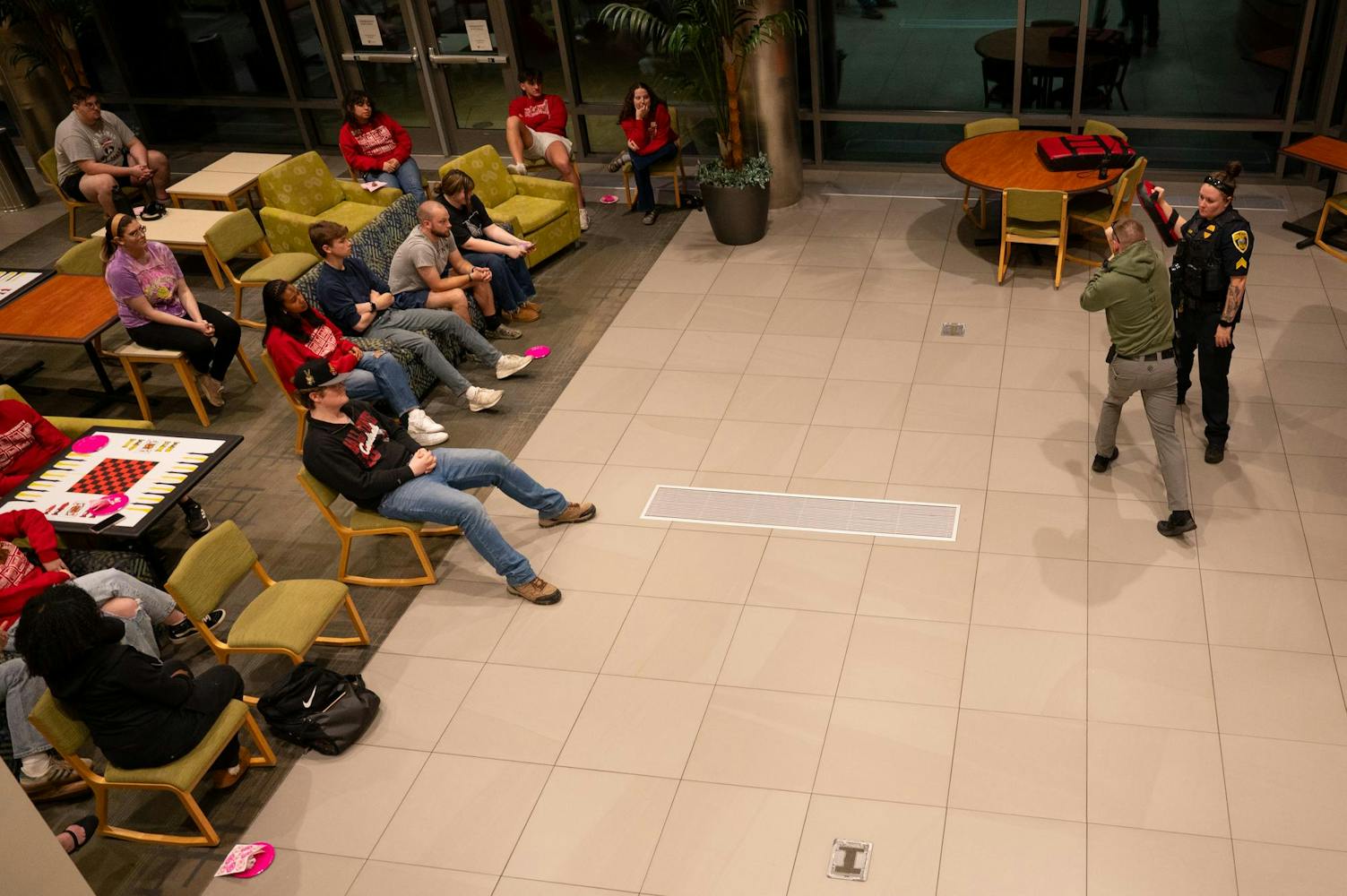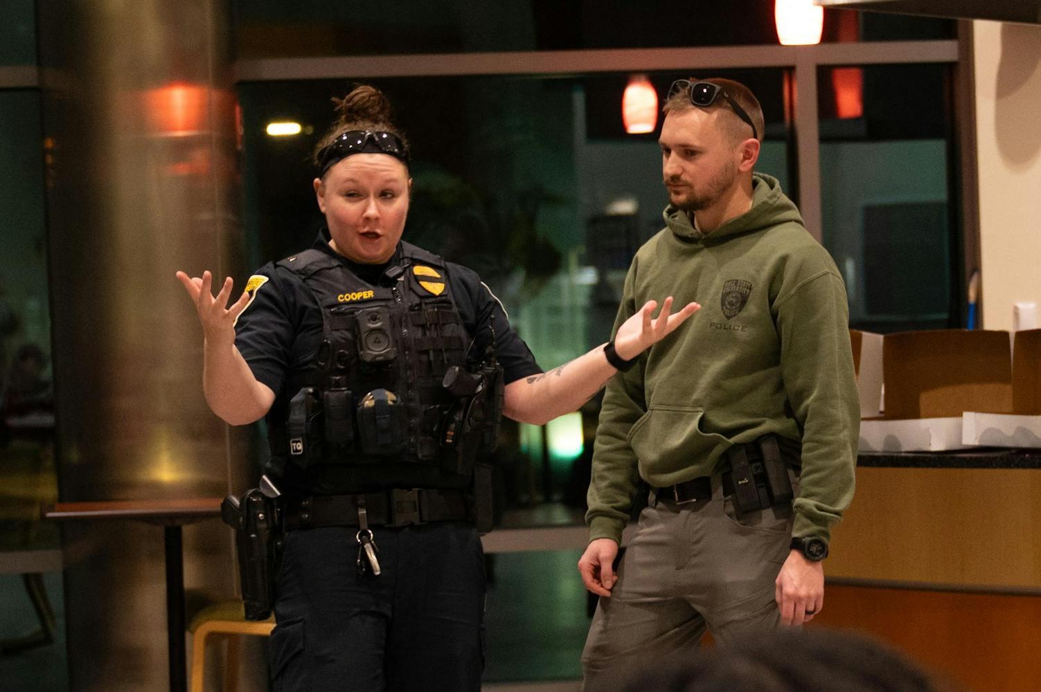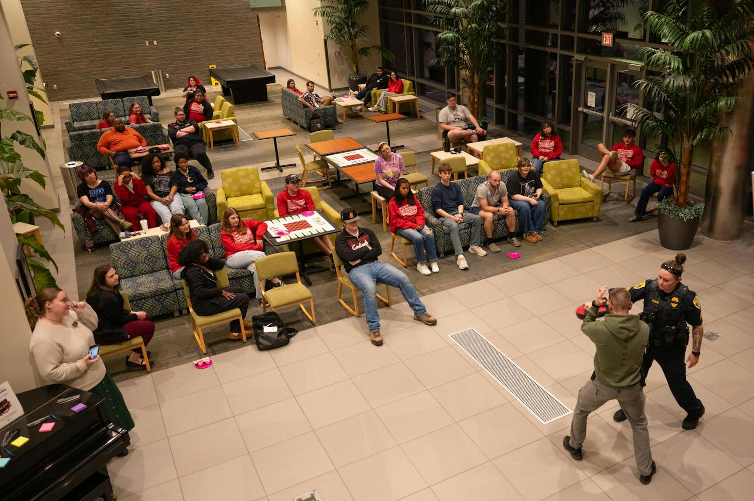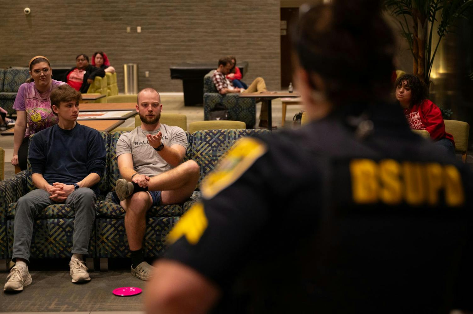 Ball State Residence Hall Botsford/Swinford hosts Self-Defense Night with UPD Sergeants Sami Cooper and Brock Bevans from 6:30-8:00 p.m. Feb. 18 in the Botsford/Swinford Hall Lobby. Self-Defense Night provided students with safety resources, self-defense tips, and free food for all attendees.