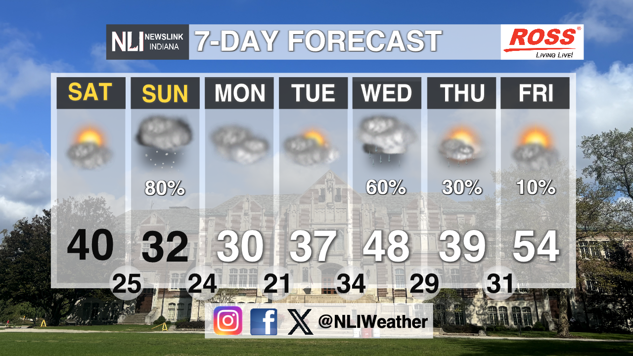 Seven-Day Forecast: Friday will be very windy with temperatures staying in the 40s until later that night. Sunday brings a 60% chance of snow flurries and some colder temperatures. The next week will slowly bring warmer temperatures with Wednesday hitting 50 degrees. Although, on Wednesday there is a 60% chance of rain showers. On Thursday the sunshine will start peeking through with the high hitting around 45 degrees.
