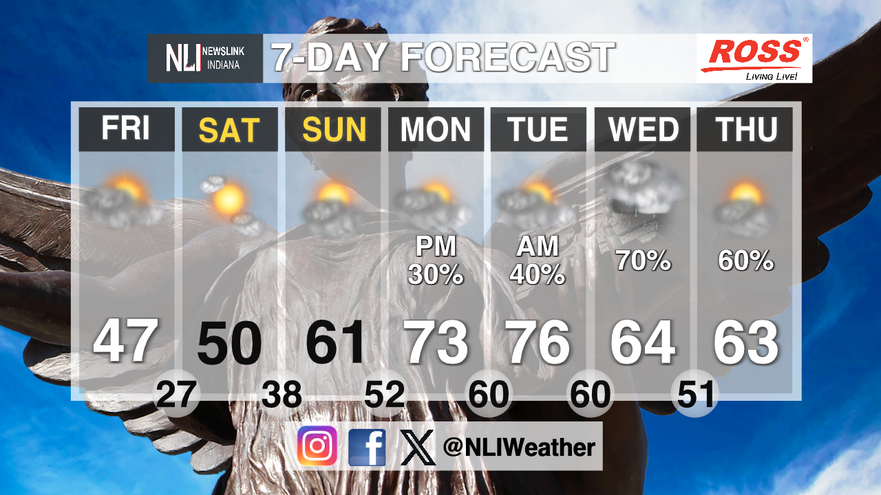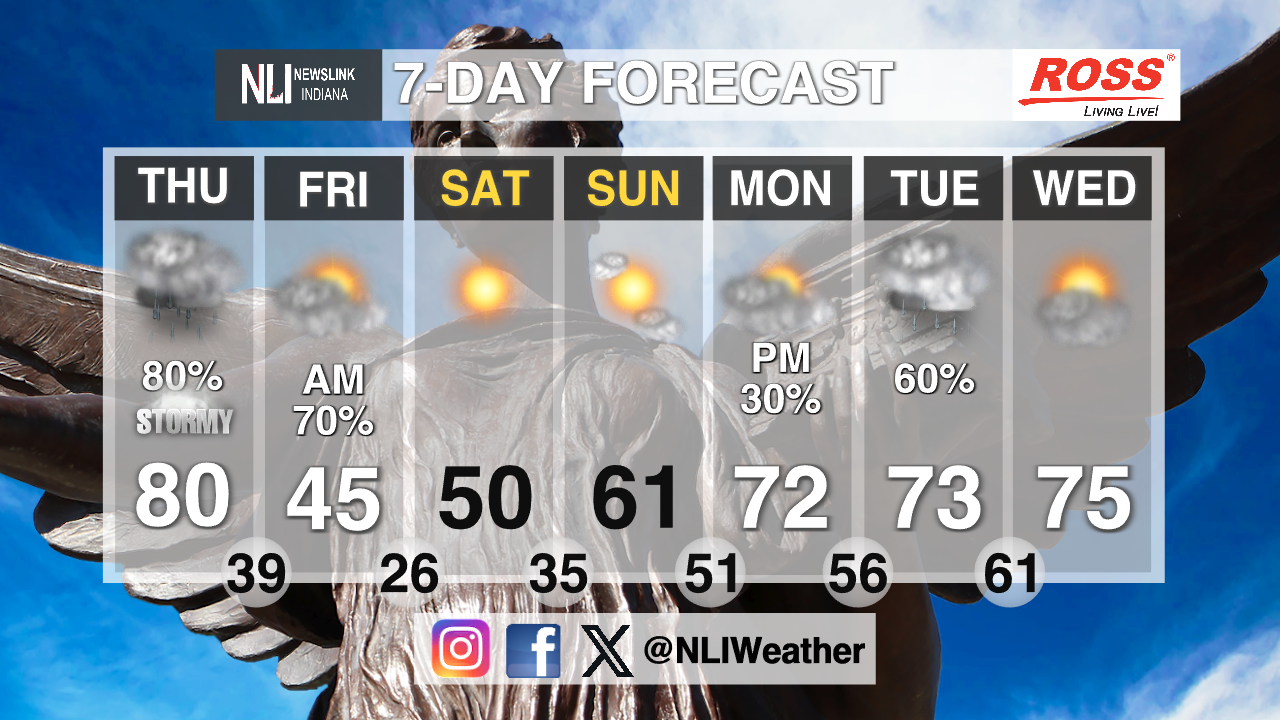 Seven-day forecast: Wednesday high of 71 but cloudy with the low of 60, Thursday high of 80 with thunderstorms in the afternoon with a brief cold front cooling the temperature leading to Fridays high being 46 degrees with morning showers and then clearing up later in the day, Saturday cloudy it with it being 52 degrees, Sunday and Monday being Mostly Cloudy with Sundays high being in the mid-60s and Monday high being 71 degrees.