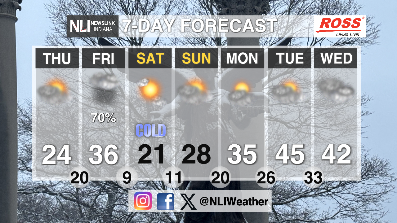 Seven-Day Forecast: Subfreezing temperatures continue but not for much longer. Throughout the next seven days temperatures will rang from a low of 21 degrees to a high of 42 degrees by early next week. You can expect partly cloudy conditions throughout with some possible sunshine and a 40 percent chance of snow flurries on Friday.