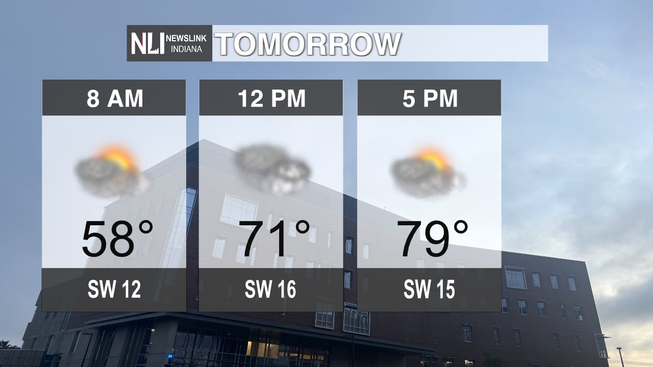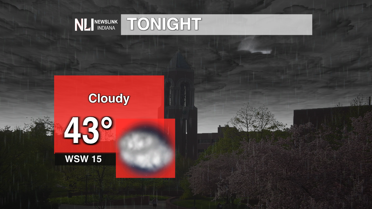 Tonight: The low will be 43 degrees with the winds coming from the west southwest at 15 mph. Clouds will be making their way into the area bringing some rain with them. There is an enhanced threat in our area bringing harsh winds, hail, and a downpour in rain. This will hit Muncie and the viewing area around 10 p.m. with the heavy rain. This will stick around until early Friday morning.