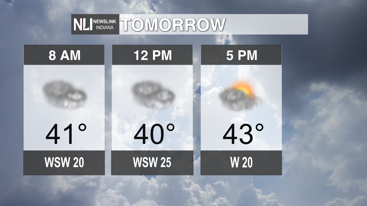 Tomorrow: The temperatures will stay moderate throughout the day with very little fluctuation in the temperatures. The winds will be coming in fast from the west southwest at 20 mph picking up slightly at 12 p.m. at 25 mph. The clouds will stick throughout the day until 5 p.m. with some sunshine peeking through.