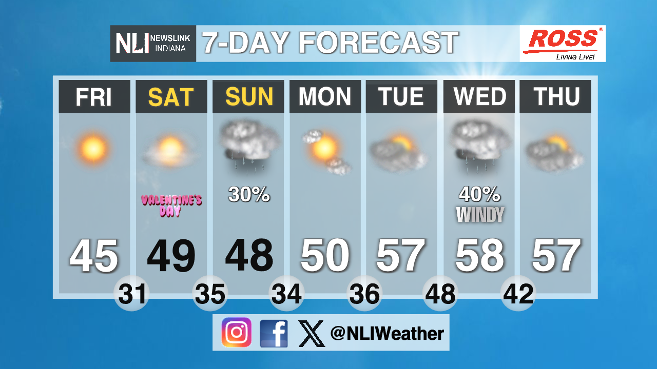 Seven-Day Forecast: High temperatures in the mid-40s for Friday and Saturday. Overcast skies on Saturday leading to rain showers Sunday morning. Temperatures trending in the low-to-mid 50s after Saturday. Low temperatures will stay above that freezing point after Friday night. Peak temperature of the week is 61 degrees for Wednesday!