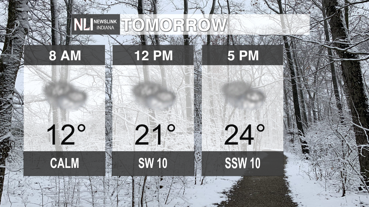 Tomorrow: Temperatures will be in the low teens tomorrow morning, but are going to rise to the mid-20s throughout the day. Skies will be cloudy with slight chances of snow flurries in the afternoon. The winds will be coming from the south-southwest at around 10 mph.