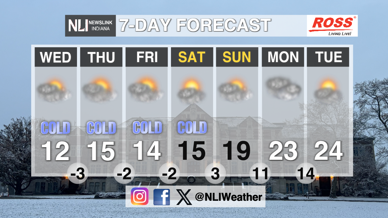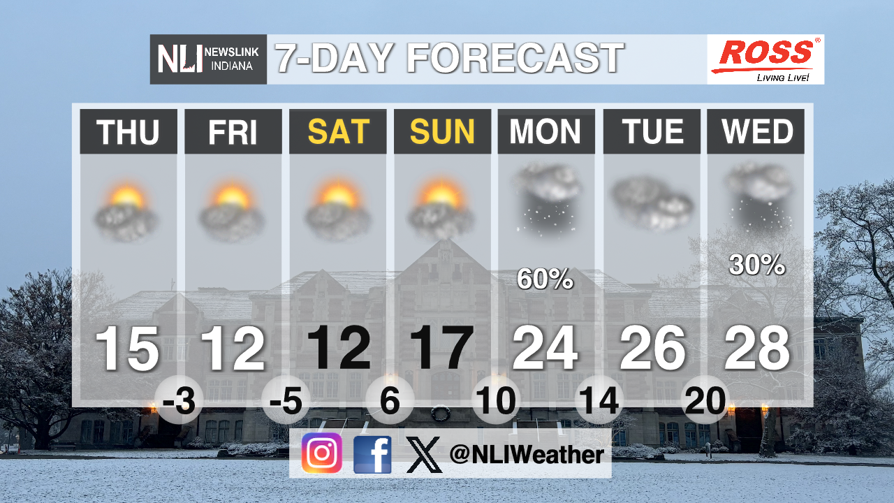 Seven-Day-Forecast: Temperatures are expected to rise slightly over the next seven days. Highs are expected to reach the high 20s, but those lows are still dangerously cold throughout the next seven days. Additionally there are cold weather advisories in place for the next couple of days due to the low temperatures dipping into the negative single digits and wind chill values in the negative teens. Lastly there are chances for snow on Monday and Wednesday next week.