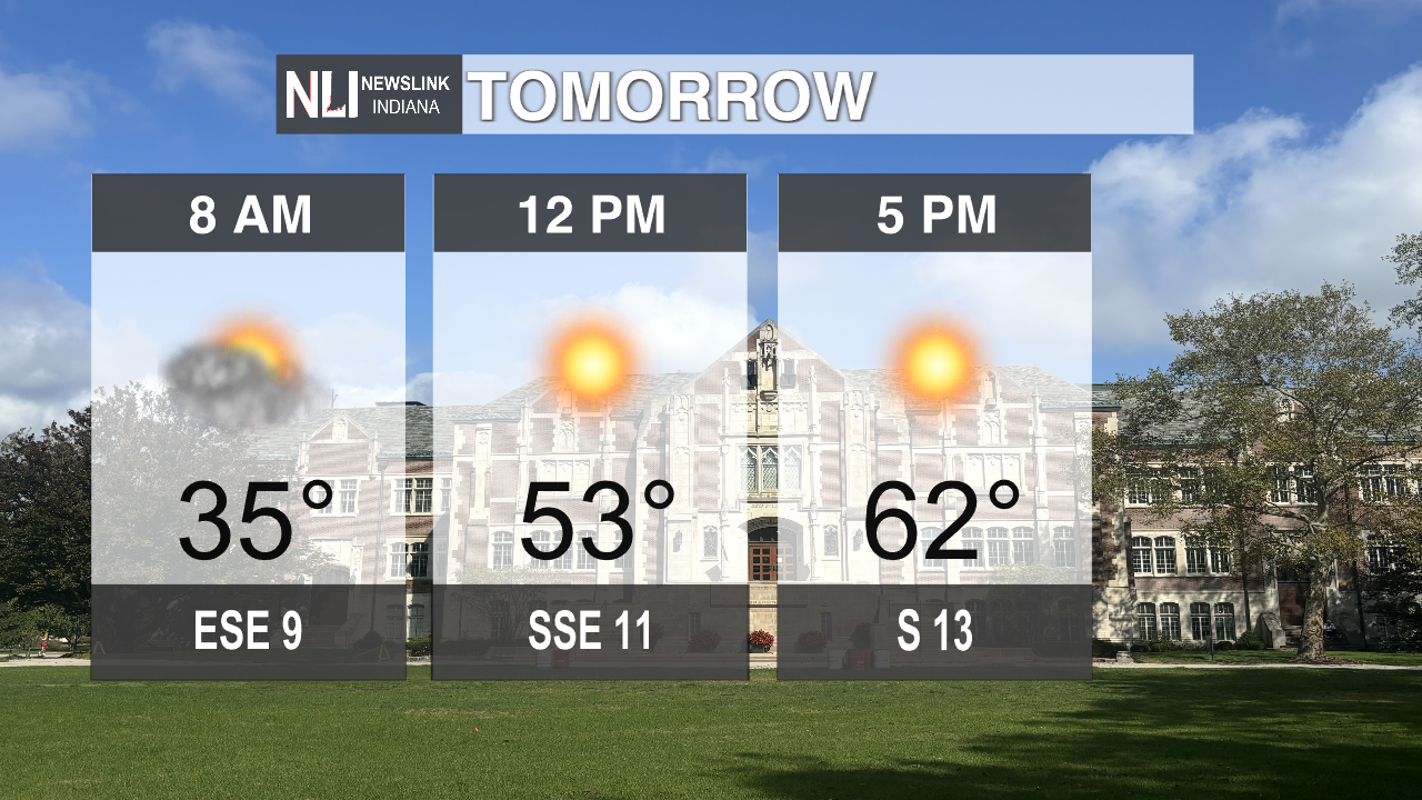 Tomorrow: A chill will carry over through the night into the morning with temperatures remaining at 28 degrees as you start your morning commute. Temperatures will slowly increase throughout the day being in the mid-to-high 30s at noon and 45 degrees for our high at 5 p.m. Conditions will be sunny and clear with winds blowing a consistent 10 mph throughout the day.