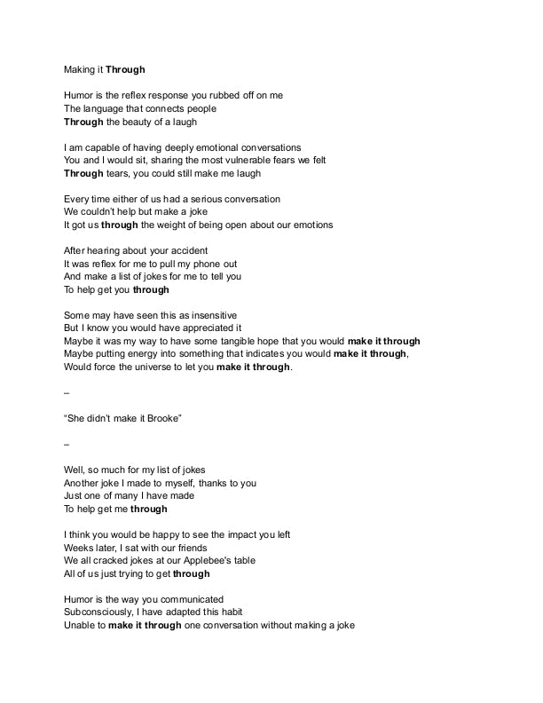My phone became my distraction. I would burrow myself in anything that wasn't my own life. Death is such a strange concept: it is confusing how an entire person can be gone in the blink of an eye. It felt like one day I would wake up from these nightmares to a phone call from her, asking to go get McDonald's.