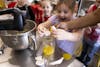 Carys Buzzard cracks an egg, with some spill, into a jar for her cookie dough batter for Santa at Now ...