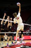 Sophomore Ryan Louis spikes the ball Feb. 26 in Worthen Arena. Ball State won against Tusculum University, ...