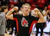 Ball State cheerleader celebrates by flexing after the game Feb. 25 at Worthen Arena. Adam Jones, DN ...