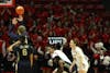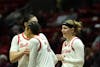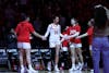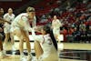 Freshman Aniss Tagayi celebrates with teammates after a basket and foul Feb. 25 at Worthen Arena. Tagayi ...