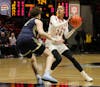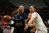 Freshman Zhen Verburgt helps teammate Salenbien Feb. 25 at Worthen Arena. Verburgt finished with 8 rebounds. ...