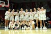 Ball State women's basketball players hold up "W" signs following their win Feb. 25 at Worthen Arena. ...