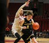 Akron senior guard Maddie Vejsicky drives the ball while being pressured by a defender Feb. 25 at Worthen ...