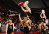 Ball State cheerleader on the shoulders of another cheerleader celebrating during a timeout Feb. 25 ...