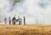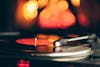 turntable with LP vinyl record against burning fire background, closeup view with headshell