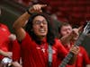Ball State Pride of Mid America Pep Band member shouts while holding up bass guitar Feb. 24 at Worthen ...