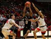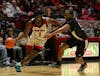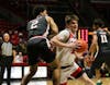 Ball State junior forward Mason Jones pushes through a U-Mass defender Feb. 24 at Worthen Arena. Jones ...