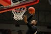 Ball State junior guard Armoni Zeigler dunks during pre-game warmups Feb. 24 at Worthen Arena. Zeigler ...