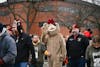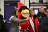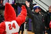 Charlie Cardinal high-fives an attendee of Muncie Mission's Walk a Mile event Feb. 21 in the Muncie ...