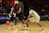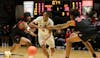 Redshirt sophomore guard Davion Hill directs his team while maintaining possession of the ball Feb. ...
