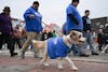 A dog adorning a campaing advertisement for a local candidate participates in Muncie Mission's Walk ...