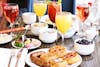 A brunch spread at a hotel with waffles, sausage, blueberries, chocolate covered strawberries.