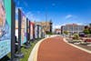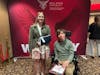 Dillon Rosenlieb and Ella Howell pose in front of a "We Fly" banner after the School of Journalism and ...