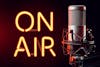 Professional silver microphone with bright orange illuminated ON AIR neon sign.