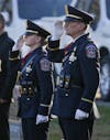 The funeral procession for Officer Blake Reynolds passes the Honor Guard presenting arms Nov. 22 at ...