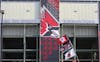Ball State flags wave at the Charlietown tailgate Oct. 18 outside of Scheumann Stadium. Mallory Hall, ...