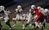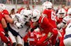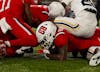 Akron players tackles Ball State player while he has the ball Oct. 18 at Scheumann Stadium. Isabella ...