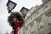 A beautifully adorned Christmas wreath hangs on a lamppost in a charming historic neighborhood. The ...