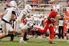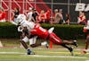 Redshirt Freshman Wide Receiver Donovan Hamilton gets tackled with the ball Oct. 18 at Scheumann Stadium. ...