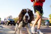 Dog walks with parade participant in the Ball State Homecoming Parade Oct. 18 on Ball State Campus. ...