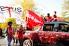Charlie Cardinal rides in a truck bed during the Ball State Homecoming Parade Oct. 18 on Ball State ...