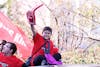 Homecoming Parade participant sits on the top of the truck and waves a foam finger Oct. 18 on Ball State ...