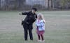 A Muncie police officer points a girl to the next base in a game of kickball. Tatum Harris, NewsLink ...