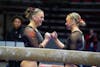 Ball State freshman Carley Stalder gets a pep talk from her teammate before the beam Feb. 15 in Worthen ...
